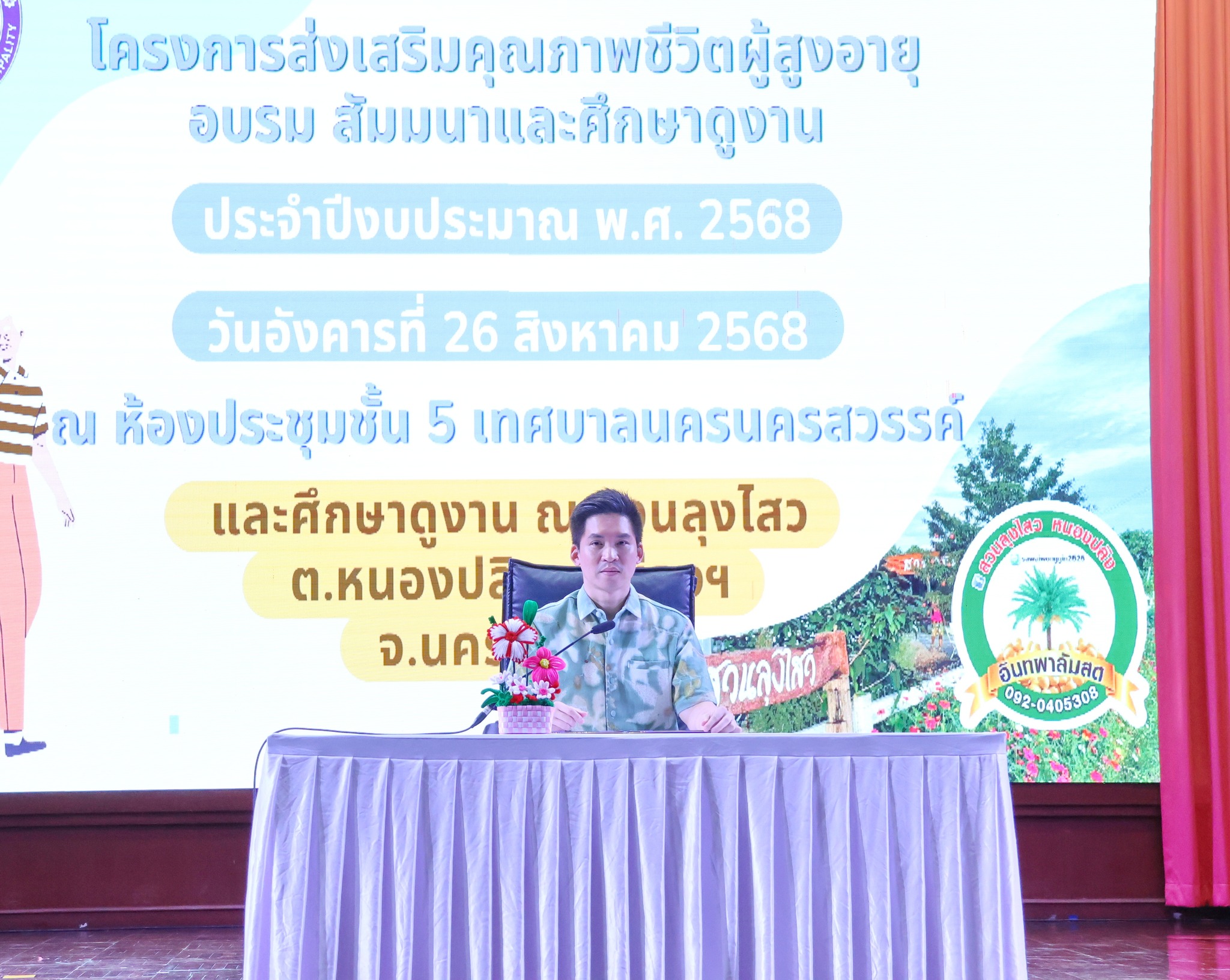 วันอังคารที่ 26 สิงหาคม พ.ศ. 2568 เวลา 09.00 น. นายจตุรวิทย์ นิโรจน์ธนรัฐ รองนายกเทศมนตรีนครนครสวรรค์ เป็นประธานในพิธีเปิดโครงการส่งเสริมคุณภาพชีวิตผู้สูงอายุ อบรม สัมมนาและศึกษาดูงาน ประจำปีงบประมาณ พ.ศ. 2568 โดยมี นายชูชีพ สัมพันธ์ รองปลัดเทศบาลนครนครสวรรค์ เป็นผู้กล่าวรายงาน พร้อมด้วยคณะผู้บริหาร สมาชิกสภาเทศบาลนครนครสวรรค์ หัวหน้าส่วนราชการ ร่วมในพิธีฯ ณ ห้องประชุมชั้น 5 เทศบาลนครนครสวรรค์